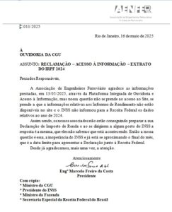 A Aenfer encaminhou, em 16 de maio, uma carta à Ouvidoria da Controladoria Geral da União (CGU) relatando que nossos associados não estavam conseguindo acessar seus informes de rendimentos na plataforma do INSS, o que os impossibilitou de realizar a declaração do IR/2024.