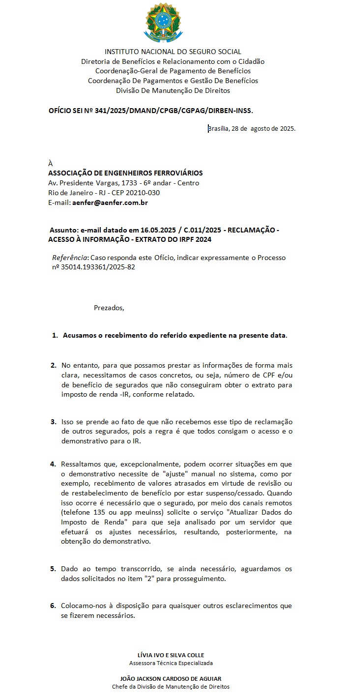 Após três meses, a Aenfer recebeu, por meio de Ofício, a resposta ao questionamento. Relembre o caso veja a resposta recebida: